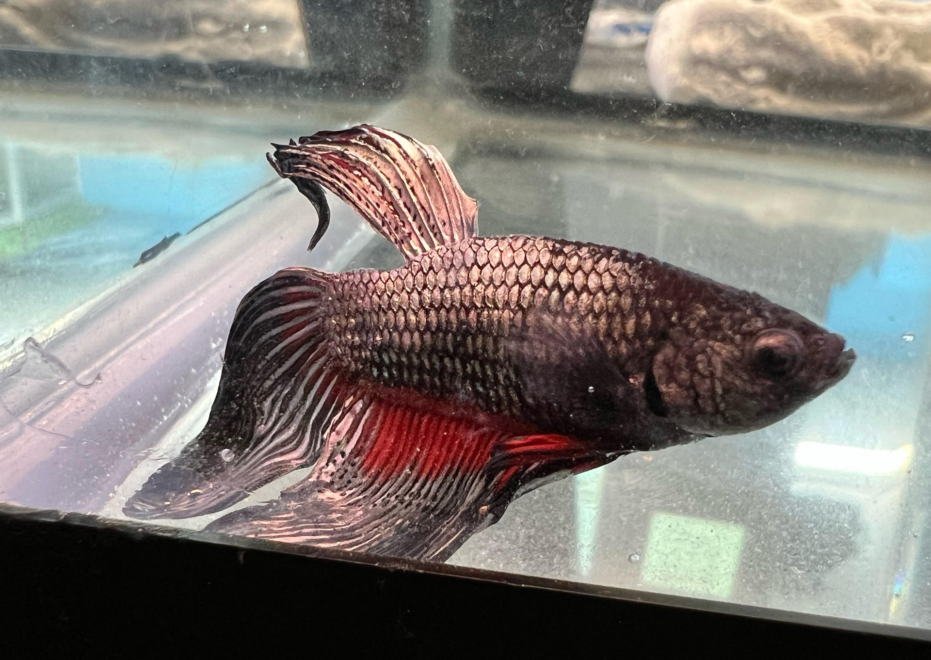 A living legend for your tank! Atlas is a Dragonscale Betta featuring a thick, metallic black armored coat and fiery red accents. Bold, resilient, and highly interactive—he is the perfect choice for hobbyists seeking a fish with a powerful presence and designer scale texture.