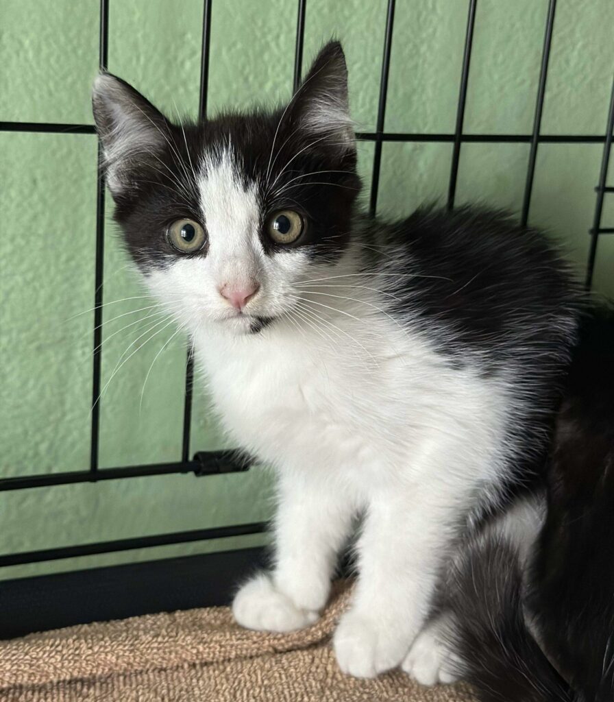 Meet Domino, a dapper little kitten who is ready to bring a touch of elegance and a lot of playfulness to your home. With his crisp white chest and paws contrasting against a sleek black coat, Domino is the definition of classic feline style. His bright, inquisitive eyes and perked ears show off a kitten who is always ready for a game of “catch the string” or a quick exploration of a new toy.
