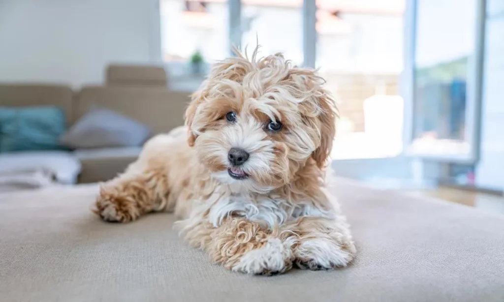 A lovable and shaggy companion with soft bi-colored fur, bright dark eyes, and a gentle, resting pose on a cozy sofa.